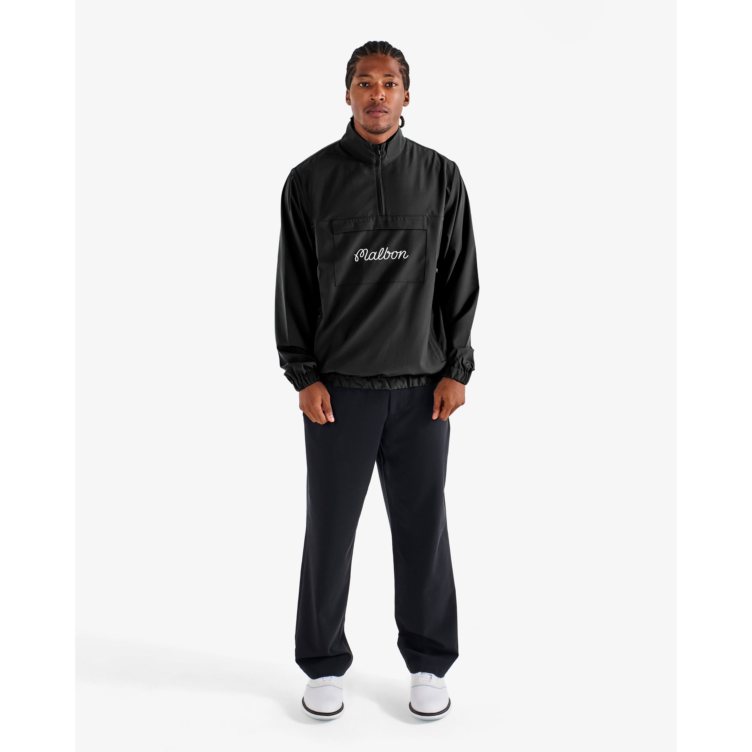 Fabrication: 100% naylon Nakakarelaks na akma Mga bulsa sa gilid Drawcord baywang at hood na may lock stoppers Contrast piping Naka -print na logo ng script ng M sa kaliwang dibdib Ang naka -print na logo ng script ng malbon sa likod
