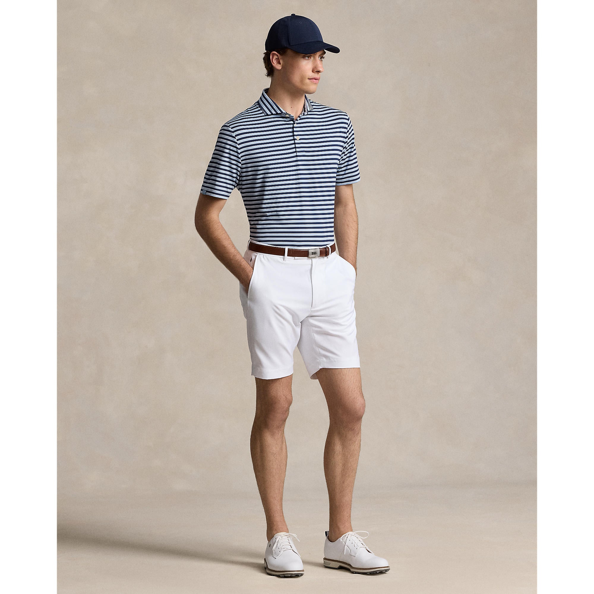 Mga klasikong guhitan na may kaginhawaan sa pagganap Ang RLX Ralph Lauren Stripe Lightweight Airflow Golf Polo Shirt sa Estate Blue Multi ay naghahatid ng walang katapusang istilo at pagganap ng paggupit. Nilikha mula sa magaan na jersey ng kahabaan, ang polo na ito ay nagtatampok ng teknolohiya ng kahalumigmigan-wicking upang mapanatili kang cool, tuyo, at komportable sa buong laro mo. Ang naka -bold na guhit na pattern ay nagsisiguro ng isang makintab na hitsura, na ginagawa itong isang maraming nalalaman na pagpipilian para sa parehong kurso at kaswal na paglabas.