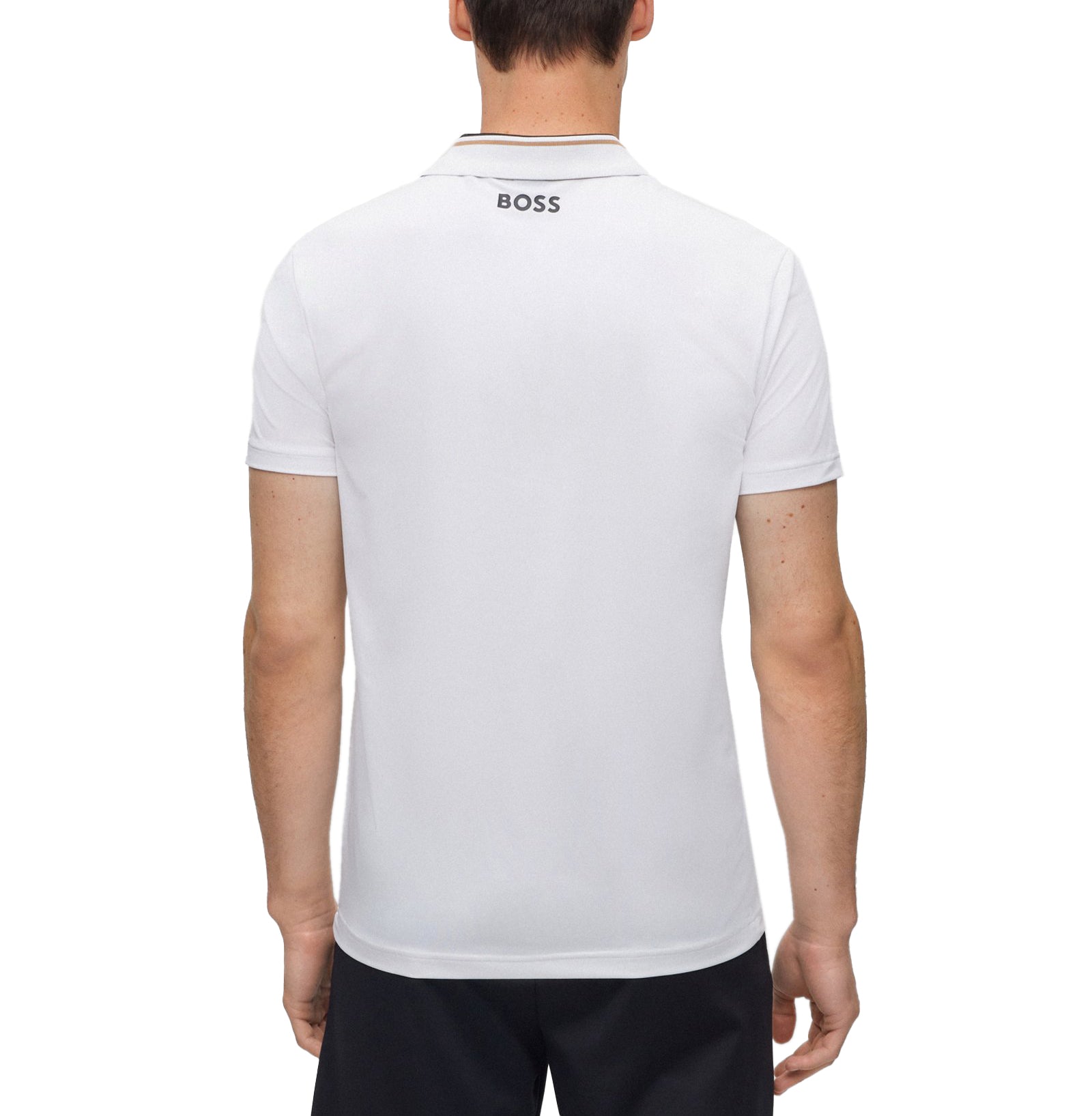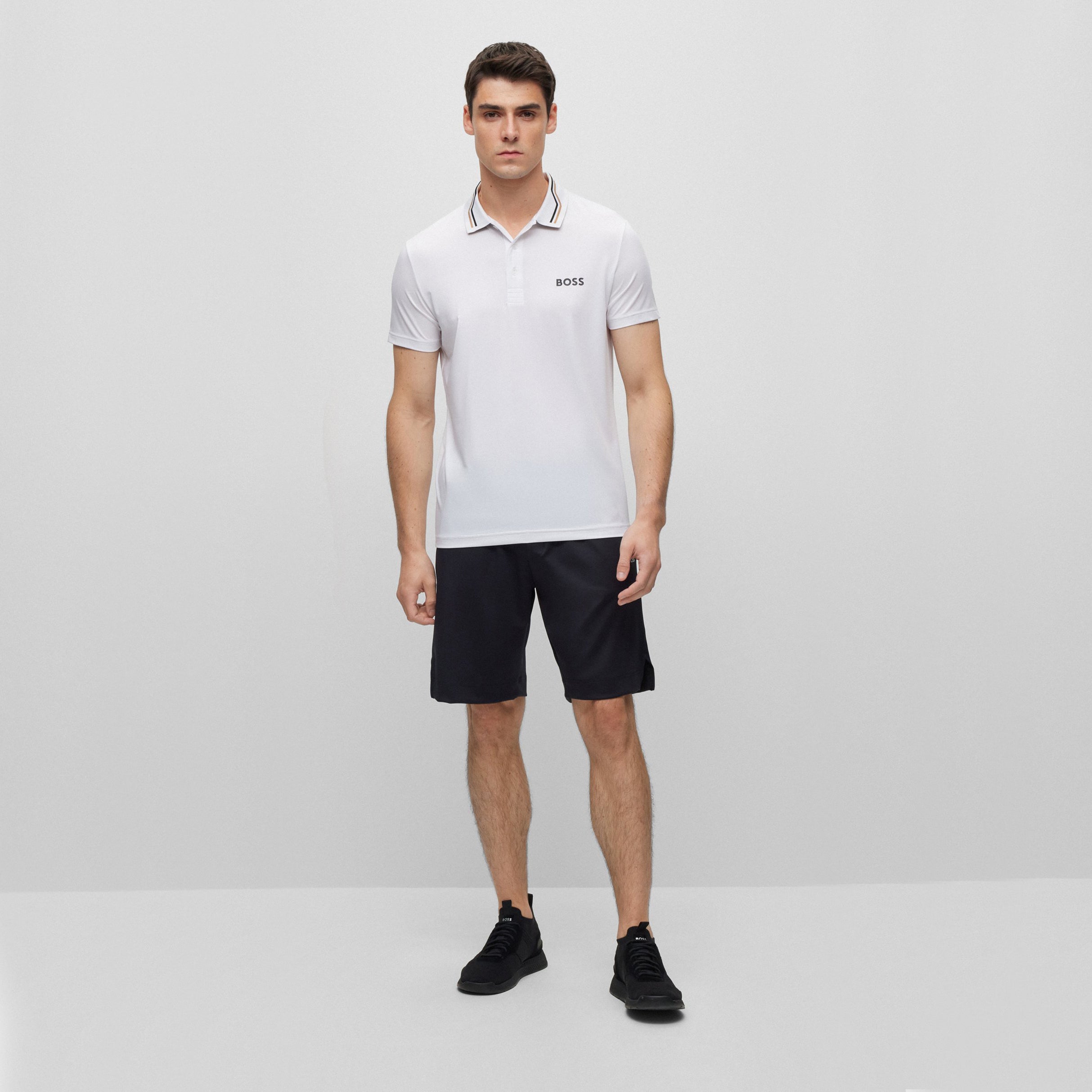 Sebuah baju polo lengan pendek dipotong dengan lurus dalam jersi regangan dengan jalur kolar dan logo kontras oleh pakaian lelaki bos. Sebahagian daripada bos dinamik X Matteo Berrettini Capsule Collection, yang dicipta oleh pemain tenis profesional Itali.
