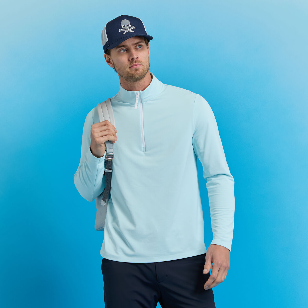 THE BRUSHED BACK QUARTER ZIP PULLOVER IS THE PERFECT SPORTY STYLE TO LAYER OVER YOUR POLO ON CHILLY MORNINGS. MADE OF LIGHTWEIGHT TECH FABRIC WITH 4-WAY STRETCH, IT'S THE STAPLE THAT KEEPS YOU MOVING ON OR OFF THE COURSE. PACK YOURS FOR A WEEKEND AWAY.