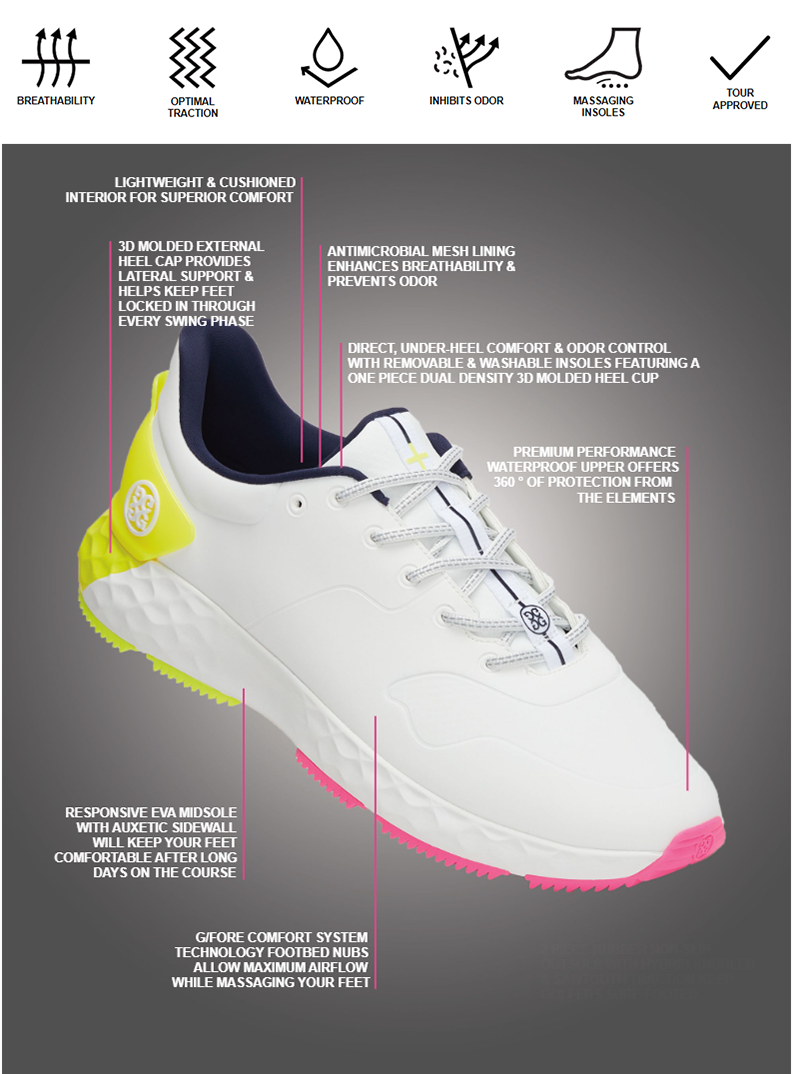 THE MEN'S MG4+ T.P.U. GOLF SHOE IS THE PERFECT COMBINATION OF LIGHTWEIGHT COMFORT AND TECHNICAL PERFORMANCE. BUILT UPON THE CLASSIC NECESSITIES OF A GOLF SHOE, BUT WITH A MODERN PERSPECTIVE, THIS STYLE BOASTS A WASHABLE, TRIPLE DENSITY FOAM CUSHION FOOTBED AND AUXETIC LATTICE MIDSOLE FOR REBOUND, PAIRED WITH A FULLY WATERPROOF HIGH ABRASION RESISTANT EXTERIOR AND 3D MOLDED EXTERNAL HEEL CUP FOR ADDITIONAL SUPPORT.