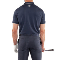 The Galvin Green Marty Golf Shirt - Navy is a classic, solid shirt with a distinctive edge — both literally and figuratively. Featuring contrasting colors on the collar and sleeve edges, this shirt combines timeless style with modern functionality. Crafted from stretch fabric, it offers excellent breathability and quick-drying performance to keep you comfortable all day, while providing UV protection (20+) for added safety on sunny days. The ribbed collar and cuffs add a refined finish, making Marty a versatile and performance-driven addition to your golf wardrobe.