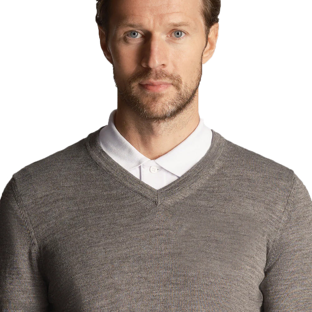 Lyle & Scott Tonal Eagle Merino Blend V Neck Knit - Mid Grey Marl