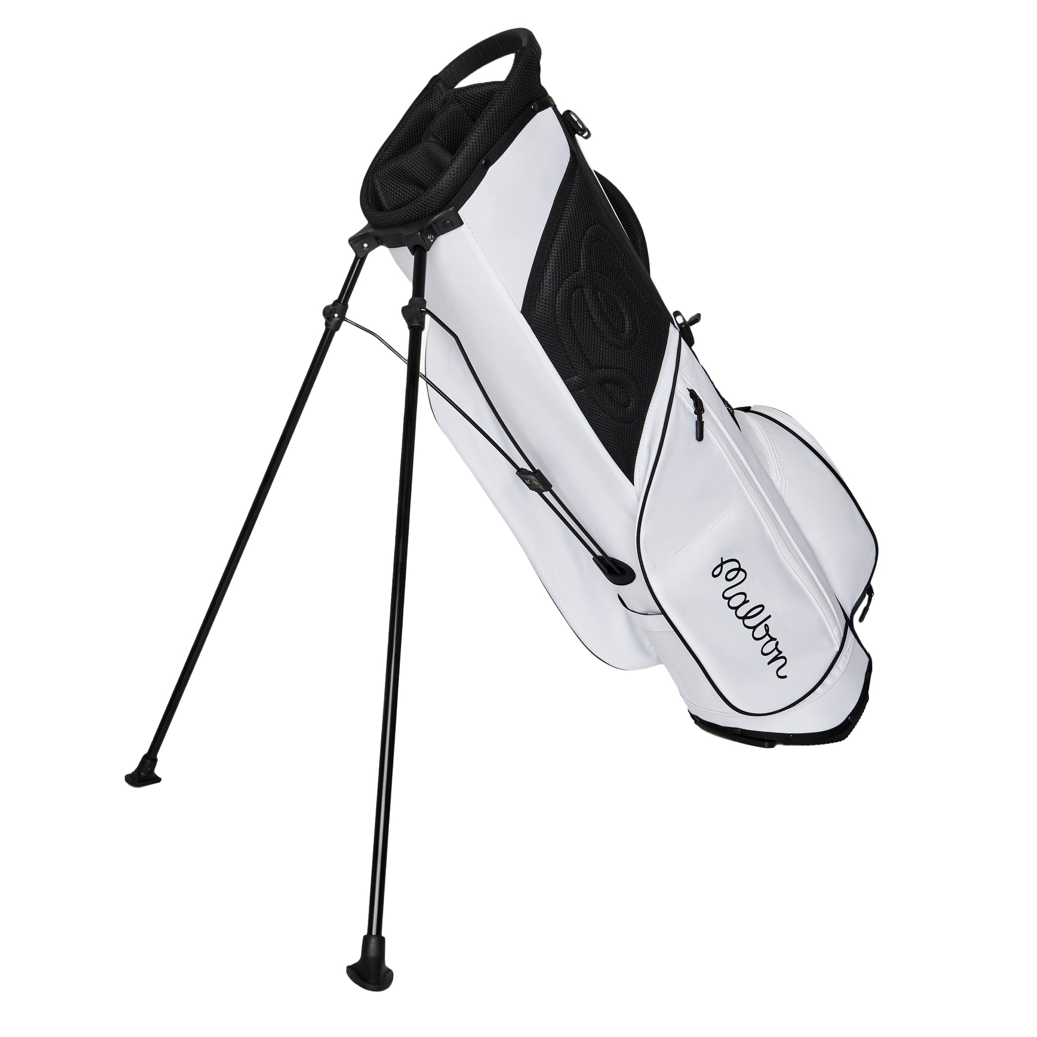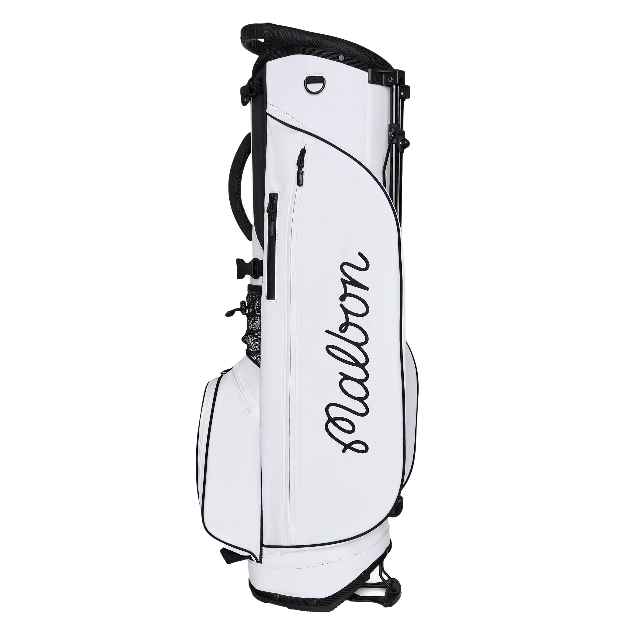 Showcasing signature Malbon branding, the Walking Bag is crafted from durable nylon rip-stop fabric, ensuring it can handle all your adventures on the course. It features multiple zippered pockets, including a convenient mesh rangefinder pocket and a magnetic closure pocket on the front for quick access to essentials. With a lightweight design—under six pounds—and cross back straps with clips, this golf bag provides maximum comfort for all-day rounds.