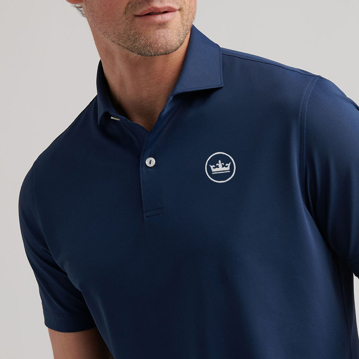 -Men's 94% polyester / 6% spandex polo -Four-way stretch, wicking, easy-care and odor-resistant properties -Edwin Spread Collar and two-button placket -Machine wash cold with colors; tumble dry low. Do not iron. Do not dry clean -PM Crown logo embroidered on wearers left chest