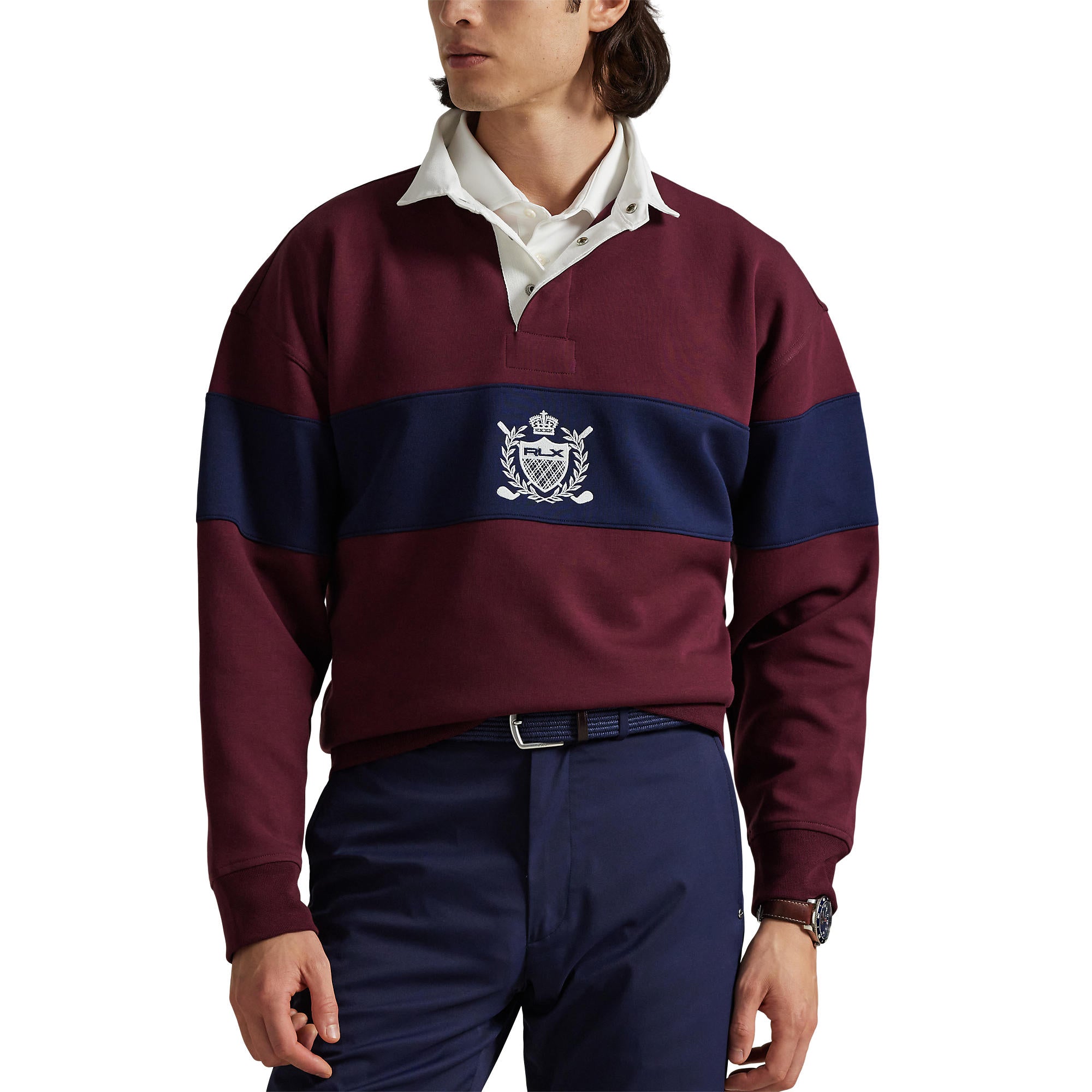 Rugby-Inspired Design: Twill rugby collar with a three-snap placket featuring rubberised snaps custom-developed with the “RLX” logo.