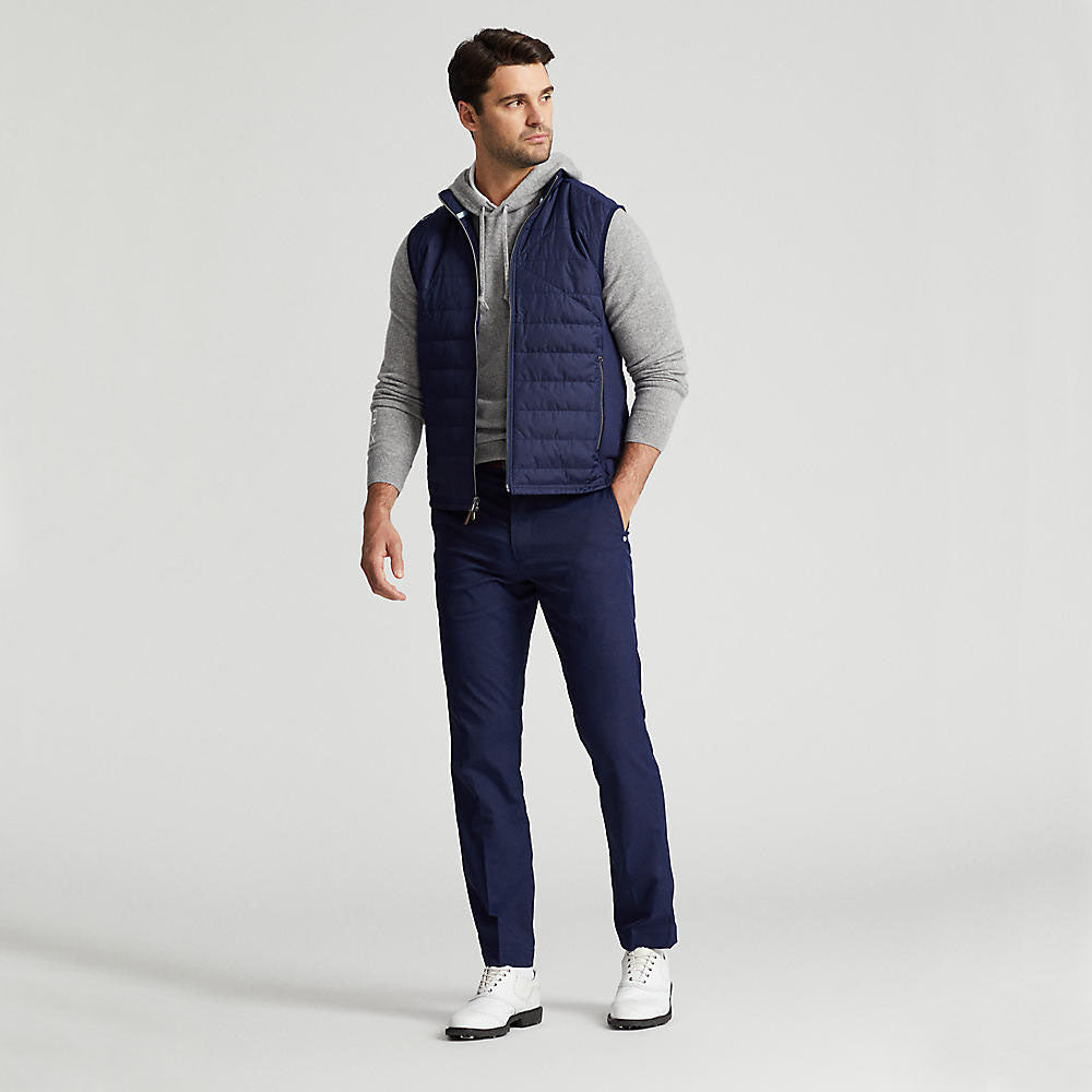 Introducing the Ralph Lauren RLX Cool Wool Hybrid Vest– a golf essential with a blend of timeless style and modern functionality. Tailored to a classic fit, this gilet features a two-way full zip for versatile wear and convenience on the course. Equipped with two zip hand pockets for added practicality, a mock neck, and bindings on the armholes, this gilet ensures both style and comfort. The quilted ripstop front panel adds a distinctive touch, enhancing the gilet's visual appeal. Complete with RLX branding, this Cool Wool Hybrid Vest is a statement piece that seamlessly combines classic design with contemporary features, making it an essential companion for your golf adventures.