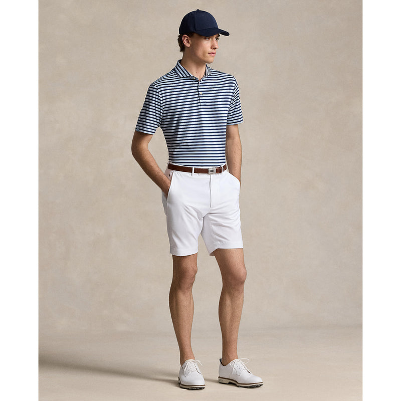 Classic Stripes with Performance Comfort The RLX Ralph Lauren Stripe Lightweight Airflow Golf Polo Shirt in Estate Blue Multi delivers timeless style and cutting-edge performance. Crafted from lightweight stretch jersey, this polo features moisture-wicking technology to keep you cool, dry, and comfortable throughout your game. The bold striped pattern ensures a polished look, making it a versatile choice for both the course and casual outings.