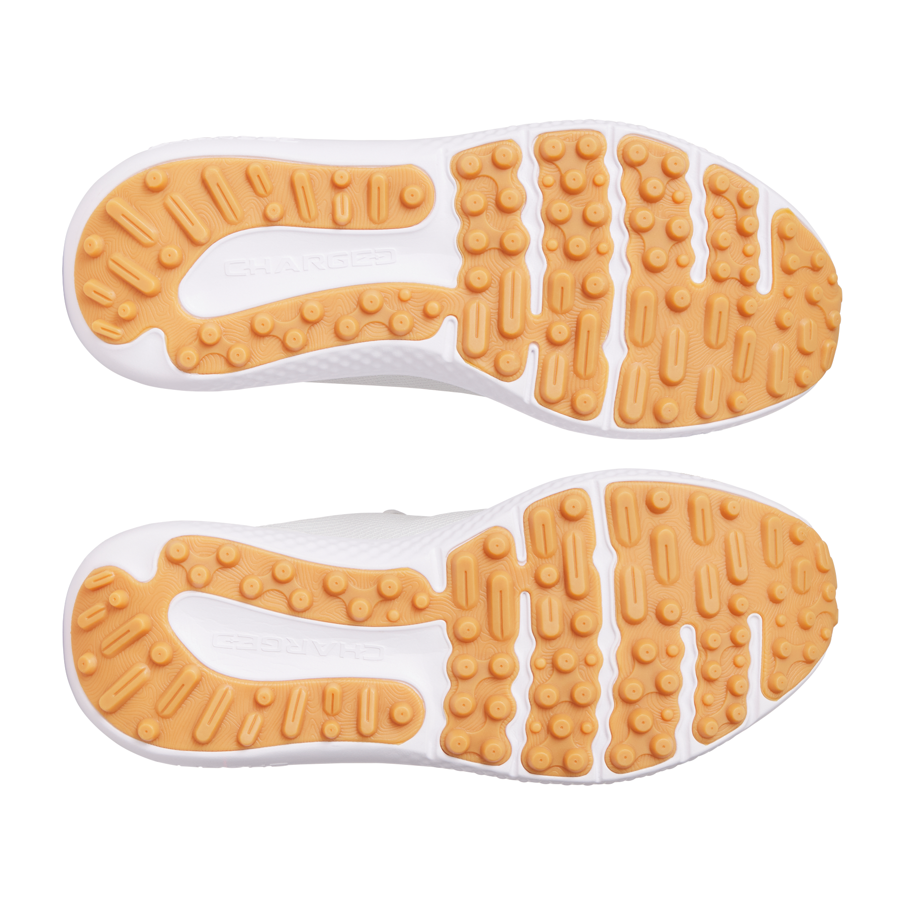 Golf shoes that keep your feet comfortable to keep you focused. The upper is light but durable, the Charged Cushioning® absorbs impact, and the Never-Wet treatment keeps you dry.